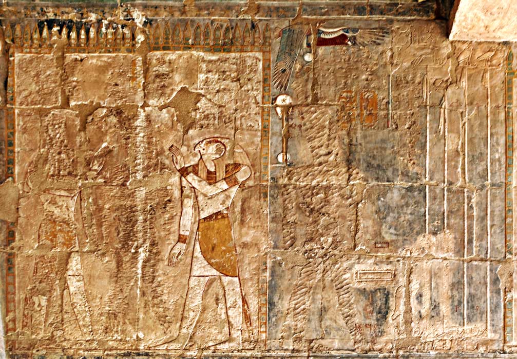 A gauche, la reine se tient dans un pavillon où Horus et Seth lui pose la couronne blanche de Haute Égypte sur la tête.