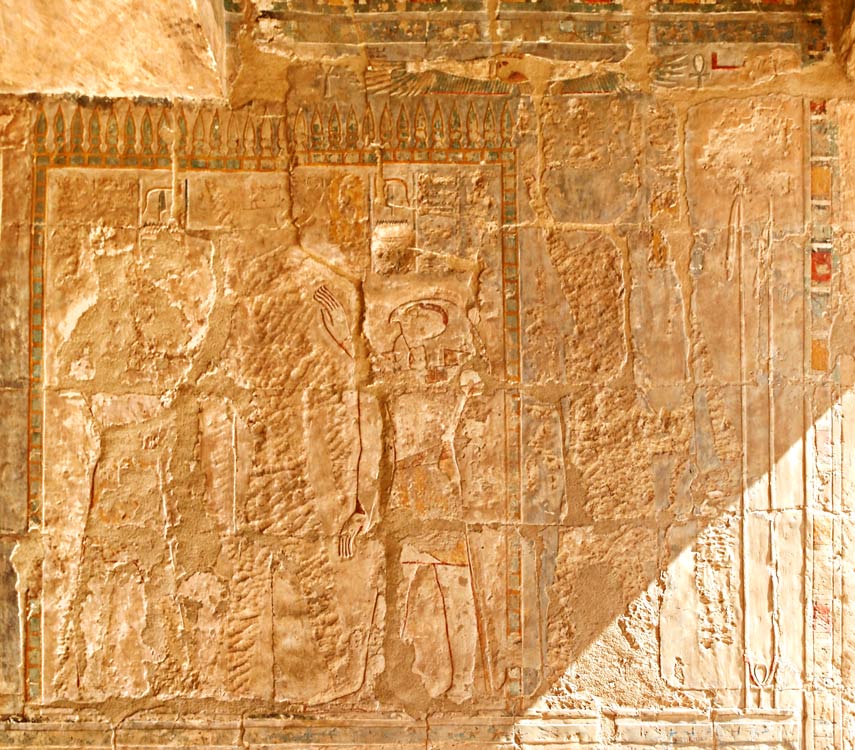 Puis précédée de 2 pavois, elle sort portant la couronne rouge. La reine et Seth sont martelés.