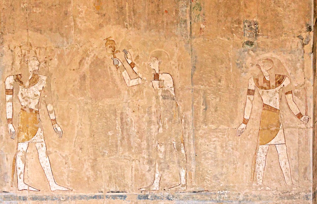 Iounmoutef emmène la reine (non représentée). Au milieu, la reine (effacée) est purifiée par le dieu Ha, dieu du désert lybique.