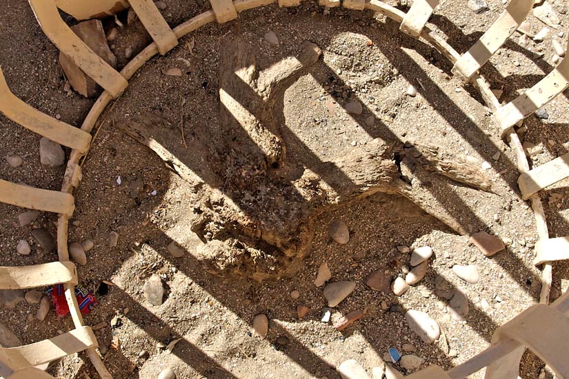 Une pancarte prévient le visiteur qu'il s'agit du reste d'un des arbres plantés par Hatchepsout.