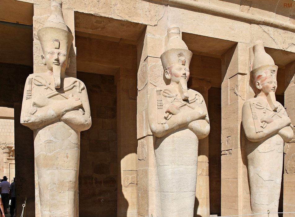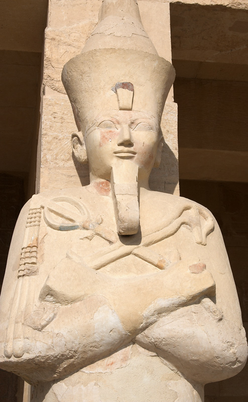 Dans ces piliers osiriaques, la reine est représentée dans l'attitude d'Osiris, les bras croisés sur la poitrine, enveloppée dans son linceul. Osiris était couramment représenté sur son trône, tenant en main ses insignes traditionnels, le fouet et le crochet. Pour suggérer l'aboutissement du voyage vers la vie éternelle, Hatchepsout y fit rajouter sur ses propres statues le signe ank, de la vie, et le sceptre ouas, de la royauté, signes en général tenus en main par les formes divines agissantes. Ces deux signes évoquent le souffle de vie, l'énergie solaire et transforment la statue en deux entités confondues, Osiris et le Soleil. (Desroches Noblecourt, Flammarion, page 148)