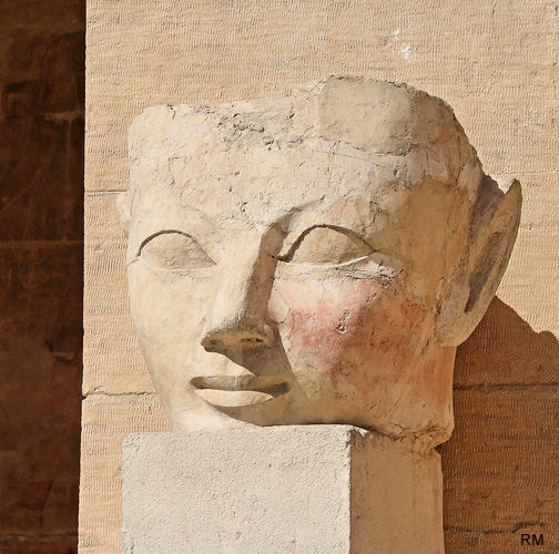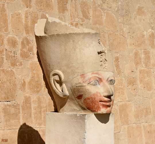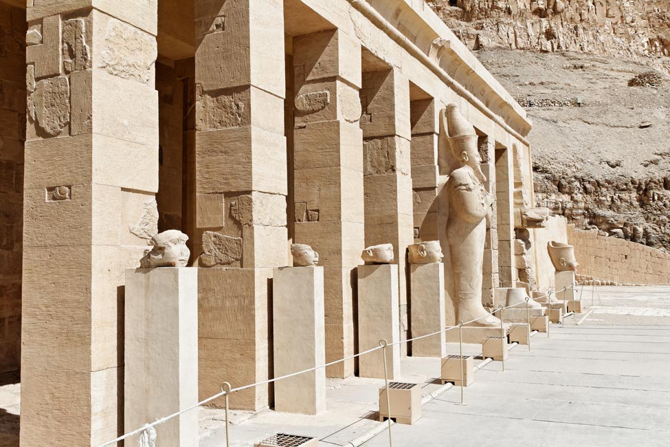Sur le côté droit du portique, différents morceaux de têtes ont été placés sur des supports.