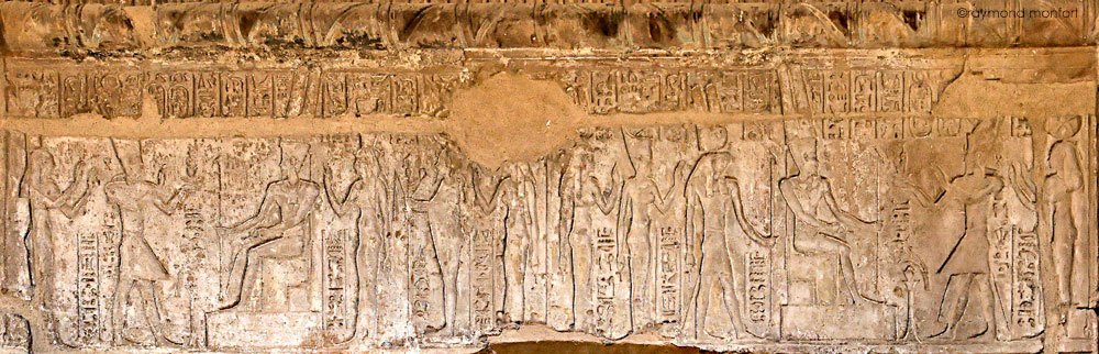A droite,Ptolémée VI Philometor offre la Maât à Amon-Rê, Montou-Rê, Amonet et Maât. Derrière lui, la Douat, la Matrice Stellaire. Il reçoit différents dons de chaque dieu.