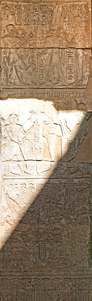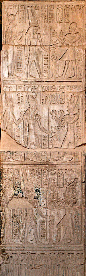 A gauche,Ptolémée VI Philometor offre la Maât à la Triade Thébaine, Amon-Rê, Mout, Khonsou et une déesse. Derrière lui, Imentet, déesse de l'Occident. Il reçoit différents dons de chaque dieu.