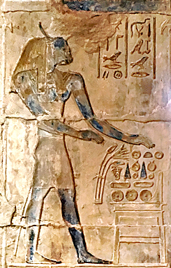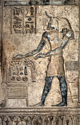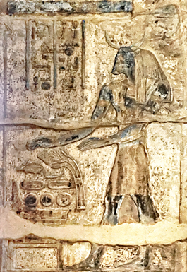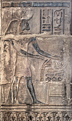 Le taureau Ageb-Our (le Grand Flot, dieu à tête de bélier représenté ici avec une tête de taureau, dieu intercesseur entre le roi et les dieux).