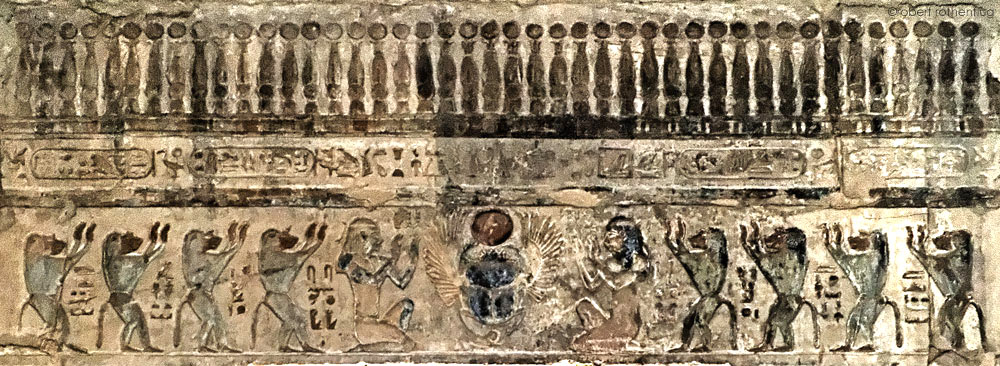 Le scarabée ailé représente la forme du soleil revenant le matin à la vie. Il est adoré à droite par Celle de l'éternité de l'instant , accompagnée de 4 babouins et à gauche par Celui de l'éternité de l'instant , accompagné lui aussi de 4 babouins. Le premier babouin de chaque côté représente l'Ogdoade. Le 2ème est dit 'Vénérer Dieu'. Le 3ème est, à droite, Celui qui est dans le bel Occident et à gauche,