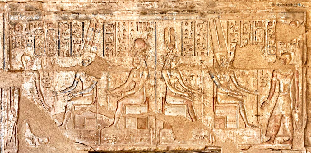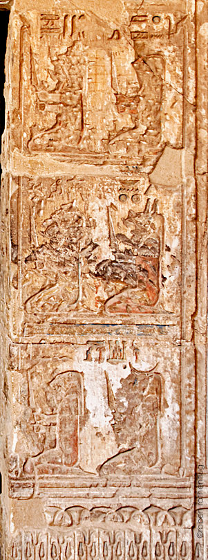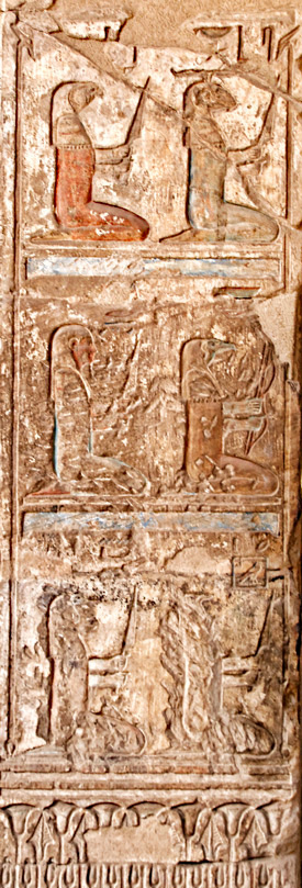 Les 2 côtés de la porte sont décorés de gardiens munis d'un couteau. Le visiteur devait prononcer leurs noms pour pouvoir entrer comme par exemple 'Fils d'Hathor' 'Maître de l'arc' 'L'enfant du Pays' etc..