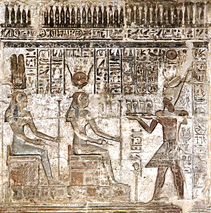 Ptolémée IV Philopator offre 4 vases d'onguent à Hathor et Maât. En haut à droite, le faucon solaire de Behedet. Les déesses répondent par différents dons pour le roi.
