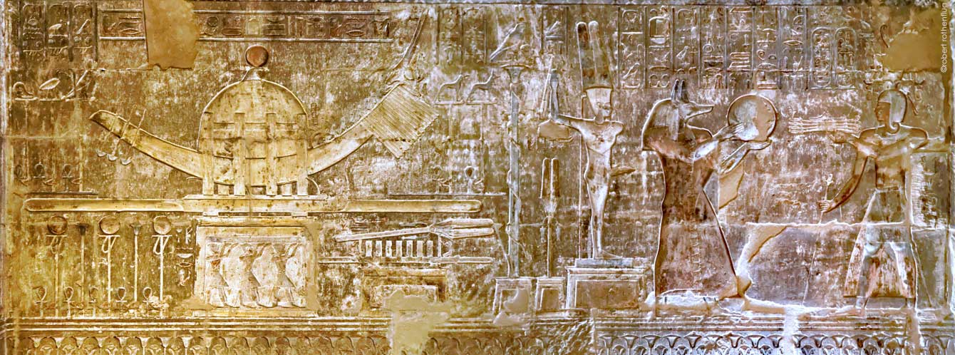 Le roi Ptolémée VI tient dans sa main gauche 4 encensoirs dits 'Bras d'Horus'. Ces encensoirs sont surmontés d'un petit roi à genoux et portent un récipient d'encens. L'encens permet la purification et sa fumée monte au ciel. L'encens favorise aussi l'érection de Min. Dans le titre, le nom de Sokar est associé au pilier Djed, ce qui est l'annonce d'une résurrection (Fermat, page 121, note 1). Anubis fait don au roi du nouveau soleil (Fermat, page 11) probablement symbole de vie éternelle. Dans la procession de la barque de Sokar, Henou, le contre-don des dieux au roi est constitué par la royauté éternelle.