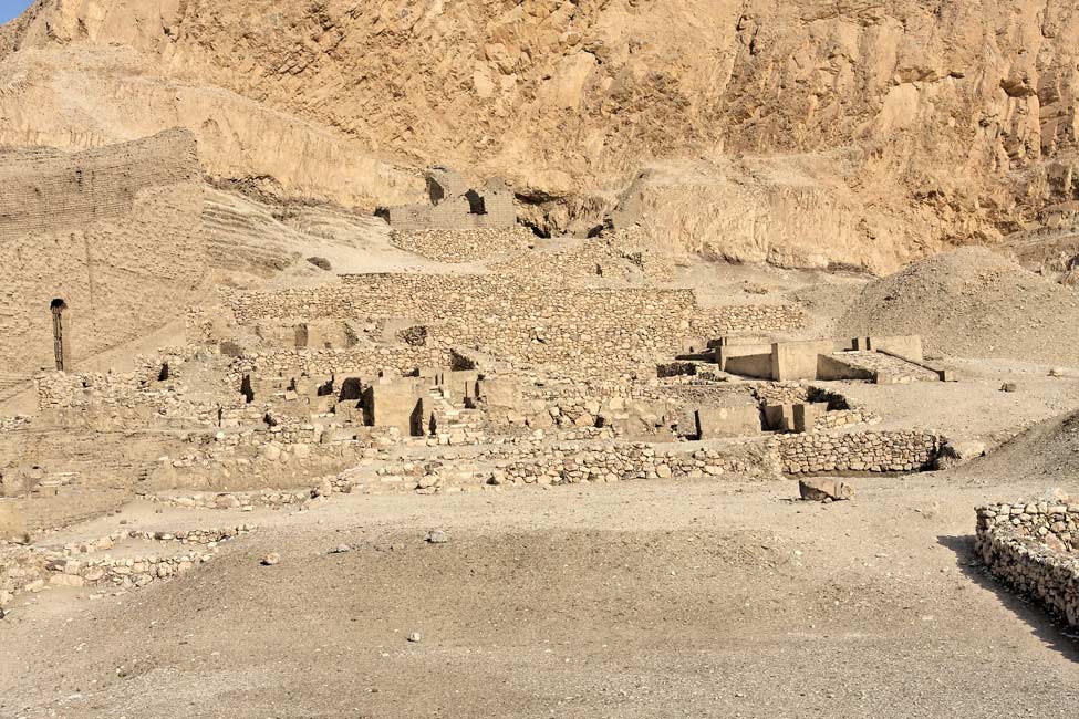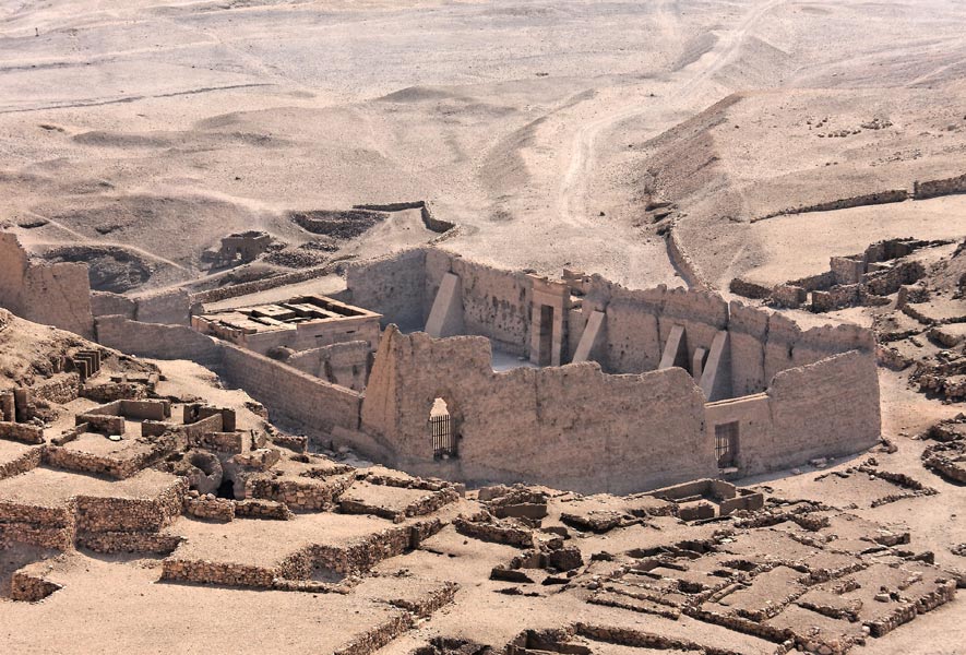 Plusieurs temples furent successivement construits lors de la période d'activité du village. A côté de l'enceinte, tout en haut de cette vue, subsistent les restes du temple d'Aménophis 1er . A l'avant plan, les restes du temple construit par Sethy 1er et dédié à la déesse Hathor indiquent que celui-ci était d'une dimension équivalente au temple actuel. Il comportait un sanctuaire triple, comme l'actuel. Ramsès II fit araser le temple construit par son père pour construire le sien, plus important, dont des vestiges furent découverts sous le parvis du temple actuel.