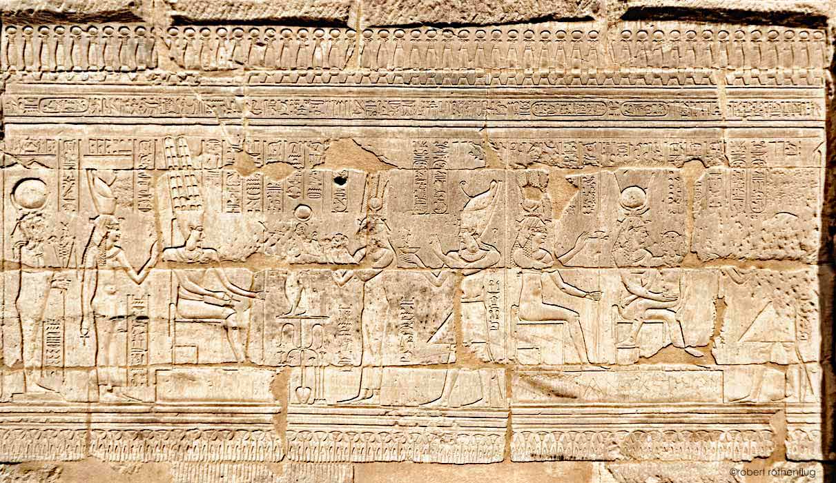 Ptolémée offre le lait pour sa mère. Hathor tient sur ses genoux Semataouy, celui qui unit les 2 terres. Elle donne au roi toute vie et toute puissance. Maât le protége.