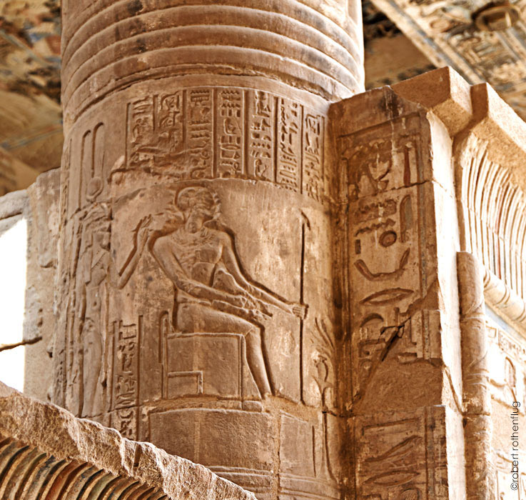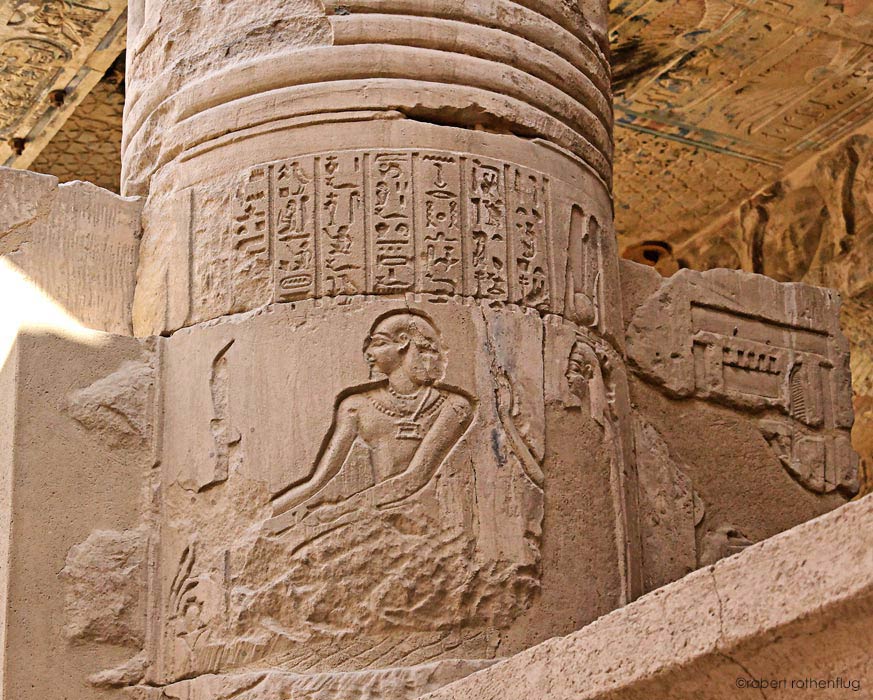 Sur cette colonne Sud, Imhotep, grand sage de l' Égypte antique, façonné par Ptah est suivi de Deux déesses qui le protègent.
