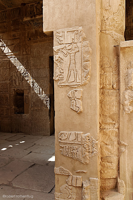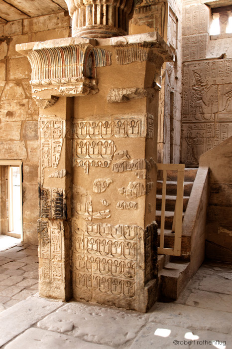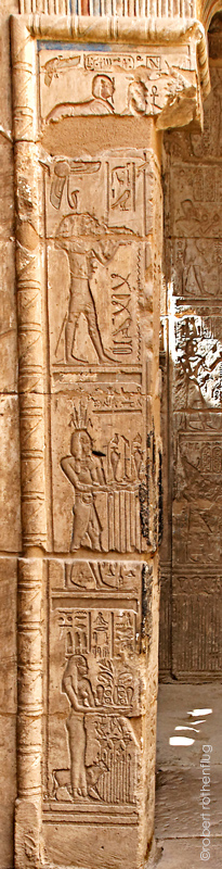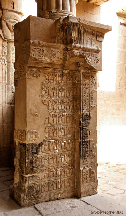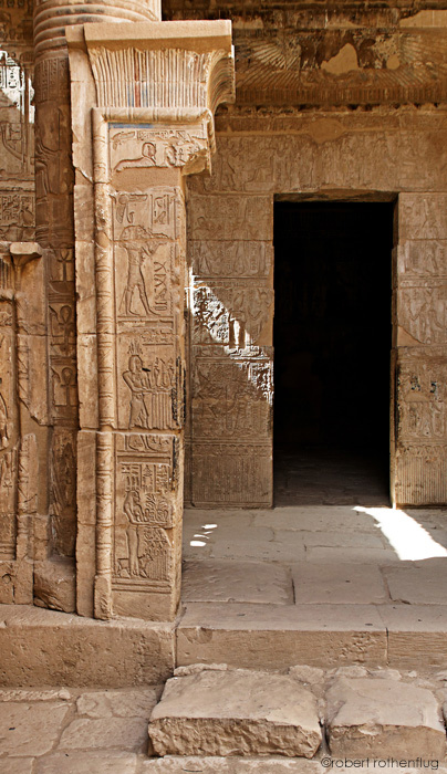 [Les piliers hathoriques][L'entrecolonnement sud][L'entrecolonnement nord][Les scènes des colonnes][Les jambages]
