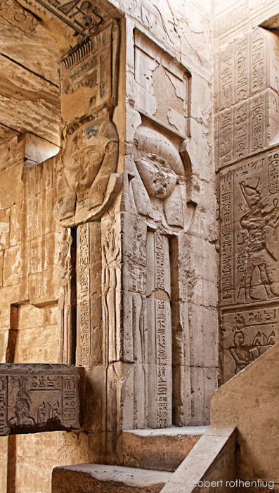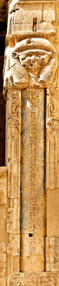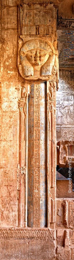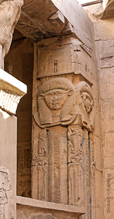 Les représentations d'Hathor différent suivant les orientations : vers l'est et le sud, les figures sont en relief par rapport au fond. Vers l'ouest, la figure d'Hathor est comme enchassée dans le pilier. La déesse est décrite dans les textes comme la mère génitrice, souveraine des femmes..