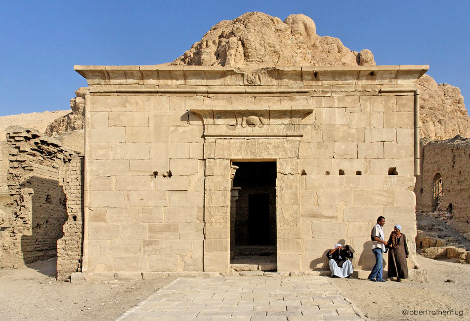 Bati en grès, le temple est de modeste dimension: 15x9 mètres. Son plan est assez simple. Une première salle hypostyle forme l'entrée : elle comporte 2 colonnes et est totalement dépourvue d'inscriptions, sauf des graffitis . La chambre du milieu ou pronaos est séparée de cette salle par un portique formé de piler's hathoriques et de murs d'entrecolonnement. A gauche du pronaos, un escalier permet d'atteindre la terrasse. En face de l'entrée du pronaos, se trouvent les entrées de 3 chapelles complètement décorées de scènes d'offrandes aux dieux et pour la chapelle sud, d'une scène de pesée du coeur inhabituelle dans les temples. André Fermat propose de commencer la visite par le pronaos, ensuite la chapelle nord, ensuite la chapelle sud, et de terminer par la chapelle centrale.