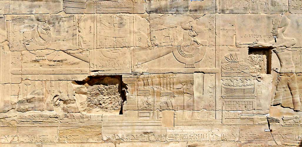 C'est la plus belle représentation de la Barque d'Amon. A droite, le roi encense une table d'offrandes et la barque. La proue de la barque est dirigée vers le temple. Oupouaout veille à l'avant. De petits pharaons s'activent sur la barque. Sous la barque, à l'avant, des représentations de colonnes pourraient être une figuration du temple de Karnak : on voit ce type de représentation dans la Fête d'Opet du Temple de Louxor en dessous de la barque gravée par Sethy 1er en complément .