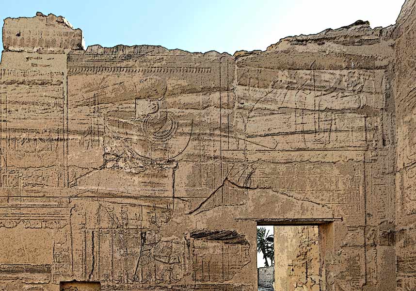 | Le traitement de postérisation permet de mieux voir les détails des enseignes sous la barque qui sont dans un ordre différent de celui du mur en face. A droite, le roi est agenouillé, sans doute devant Amon. |