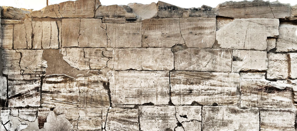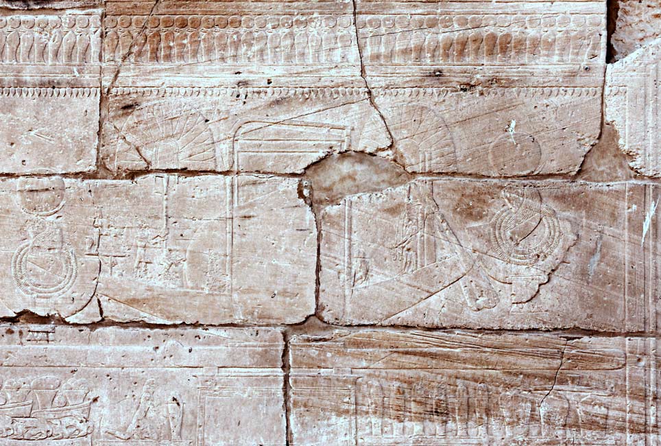 Cette vue montre une portion de mur encore debout dans cette salle. On devine le dessin de la barque, que vous pourrez mieux voir ci-dessous. D'après Porter et Moss, il y existe 3 scènes : à gauche, Sethy offre un vase à Amon et Khonsou dont on devine les coiffes.