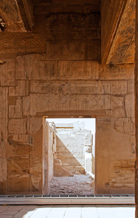 Ces scènes se trouvent au-dessus de la porte de la chapelle de la Barque de Khonsou (porte que vous pouvez voir ci-dessous). Tout en haut, une scène d'offrande d'un bouquet à Amon et Khonsou par Ramsès II. Sur le linteau, une double scène d'offrandes de vases-nou et d'adoration de Khonsou par le même roi.