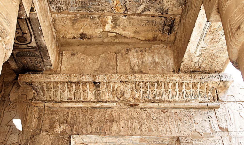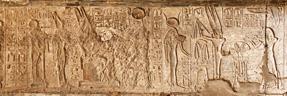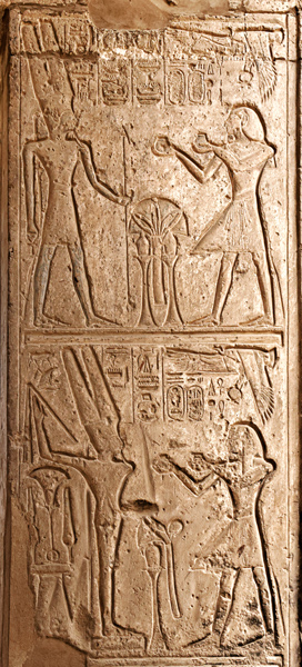 Les scènes du linteau sont ici représentées par ces 2 images. Dans des scènes symétriques, Ramsès II offre des vases à Amon accompagné de Mout en haut (à gauche du linteau) et d'Isis en bas (à droite du linteau). Au milieu, les 2 scènes représentent Ramsès II devant le Triade Thébaine.