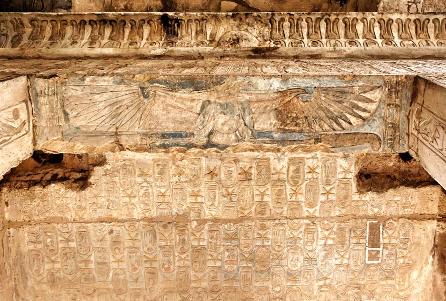 Le vautour Nekhbet (?) protège le passage. Vers l'intérieur de la chapelle, l'épaisseur du mur est gravé alternativement des cartouches de Ramsès Ier et de Sethy 1er. Cette partie a été creusée pour tenir compte des axes des vantaux de la porte.