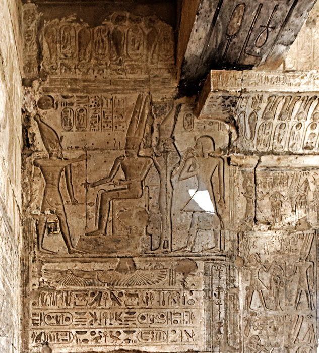 Au dessus de la porte, une scène avec Ramsès II encensant Amon, Mout et Sethy 1er.