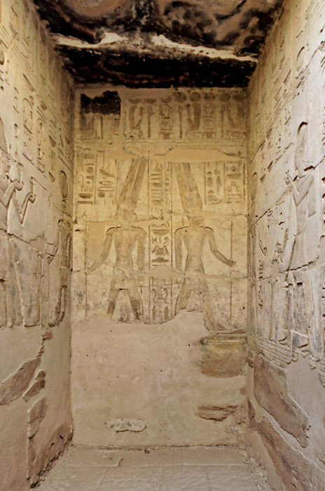 | C'est également une salle assez étroite entièrement décorée sous le règne de Ramsès II en relief dans le creux. Dans le fond, une double scène avec Amon regardant vers l'extèrieur. |