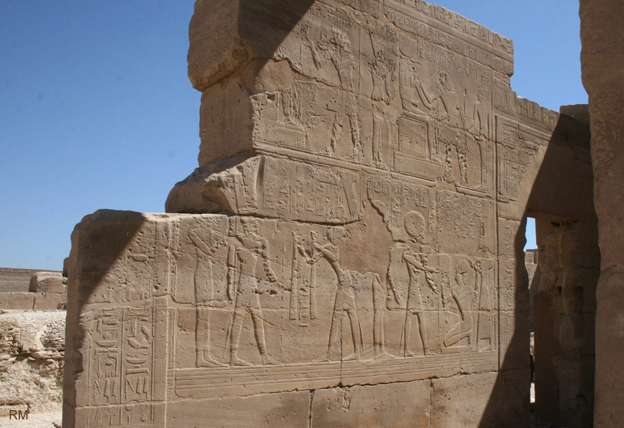 La salle XVI se situe dans la partie ouest du temple. Elle est dédiée en partie aux dieux d'Héliopolis. Cette salle était également le sanctuaire du temple, comme le montrent certaines des scènes extraites du rituel divin journalier, comme l'ouverture et la fermeture de la chapelle. A côté de cette salle, se trouve la salle XIX : au verso du mur ci-dessus, se trouve