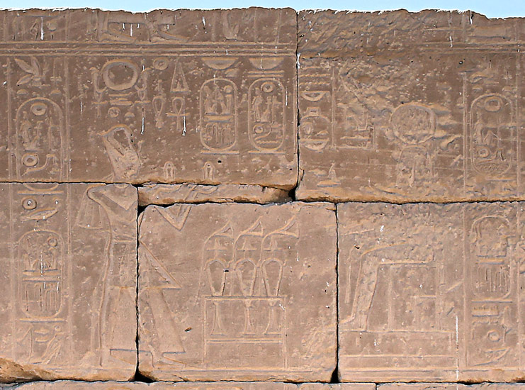 Registre du milieu Scène 9 à gauche : l'image de Maât à Amon. Scène 10 : le roi encense Montou. Scène 11 : il offre du vin à Amon.