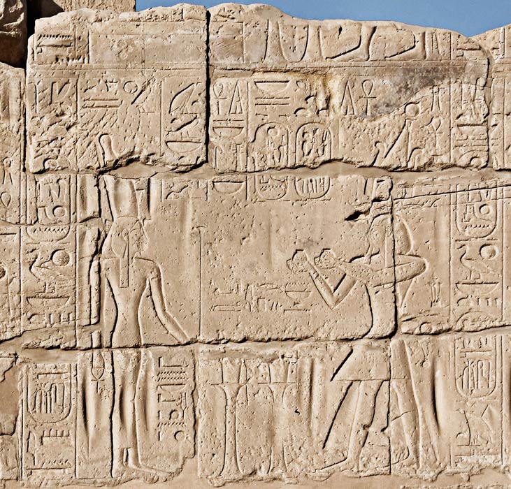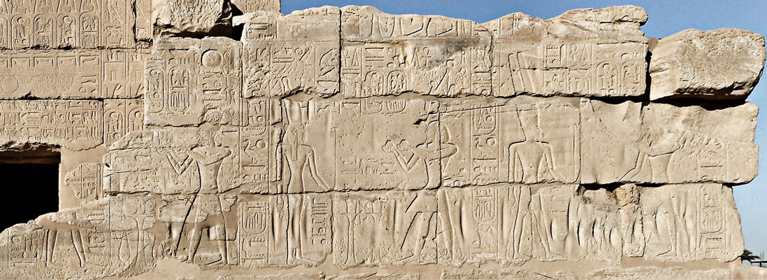 | Ce mur délimitait le temple. Il n'en reste que cette partie, décorée de trois scènes. A droite de la scène centrale, Ramsès II encense Amon et lui verse une libation. A gauche, il présente un récipient à probablement Khonsou, puisque la scène du milieu concerne Mout. |