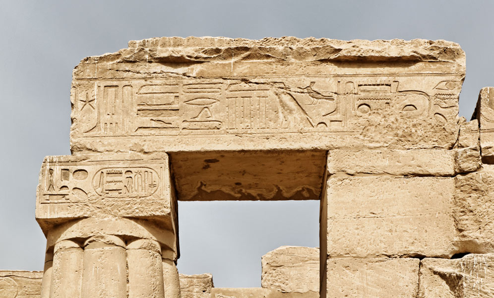 Sur l'architrave, probablement le nom de la porte. Sur la colonne de gauche, le cartouche de Ramsès précédé de "Aimé de Path, Fils de Rê".