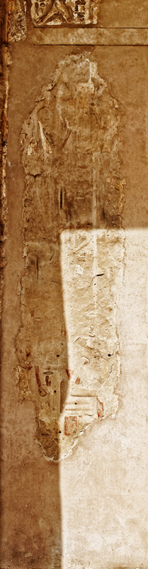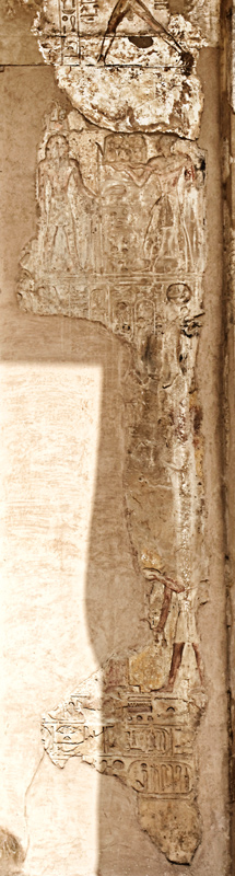 Sur le côté gauche, on devine la scène en bas où Sechat est assistée du dieu Sedjem qui tient le godet d'eau.