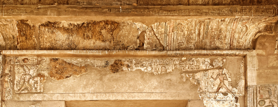 Sur le linteau, on peut encore voir les coursesrituelles, scènes habituelles à cet emplacement.