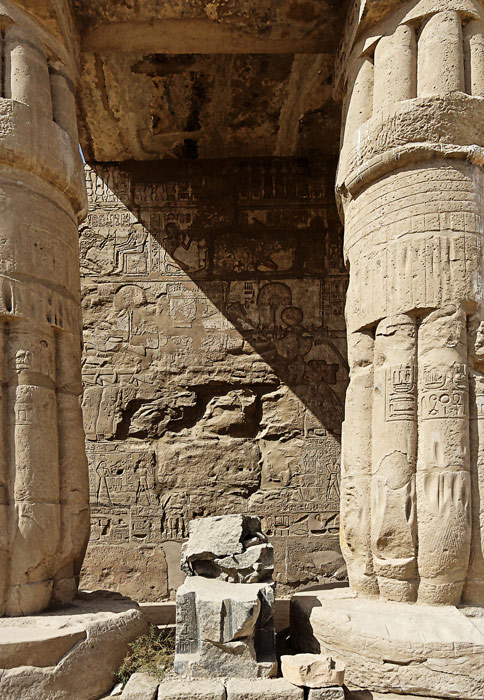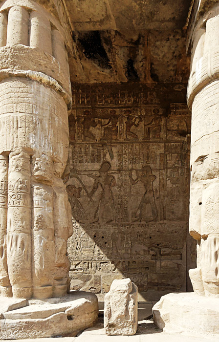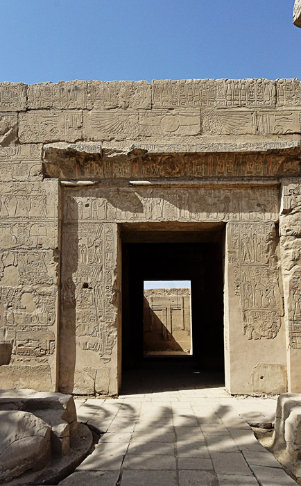 | Cette porte est l'entrée d'une salle hypostyle ouvrant sur d'autres chapelles et formant un temple dans le temple dédié à Ramsès I. La porte est en retrait par rapport au mur du portique, comme si le mur avait été rajouté sur un monument pré-existant (Ph. Martinez, 2007). |