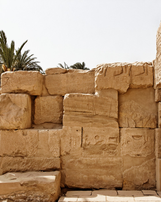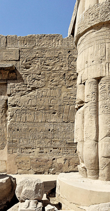 Sur la suite du mur, se trouvent les différents registres. Ici les barques de Mout et de Khonsou suivent la barque d'Amon. Les petites scènes du haut sont difficillement lisibles. |