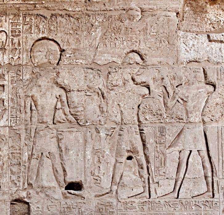 Ramsès II court avec 2 vases dans un rite tirée des fêtes heb-sed. Devant lui, Amon-Rê, représenté ithyphallique comme Min. Représenté comme Min, Amon-Rê-Kamoutef est très semblable à Amenope du temple de Louxor, mais serait une forme spécifique du temple de Gournah (Brand, 1998). Il est dit ici : "..muni de ses beautés".