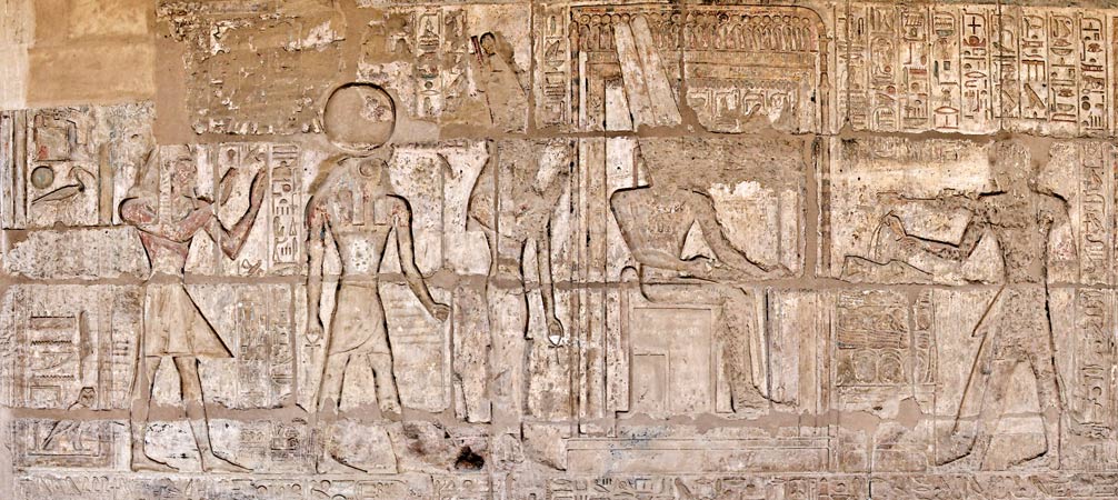 Dans cette scène, Ramsès II et un prêtre font une libation (?) à Horus.