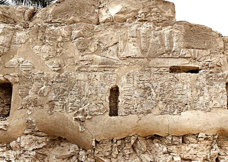 Sur les restes des parois du passage au milieu du pylône, quelques écritures et décorations subsistent. On peut reconnaître les cartouches avec les noms de Sethy.