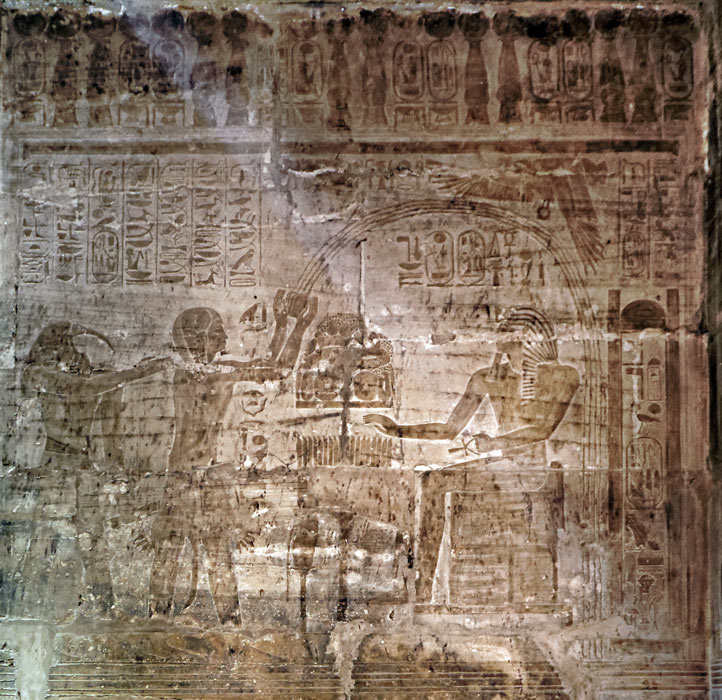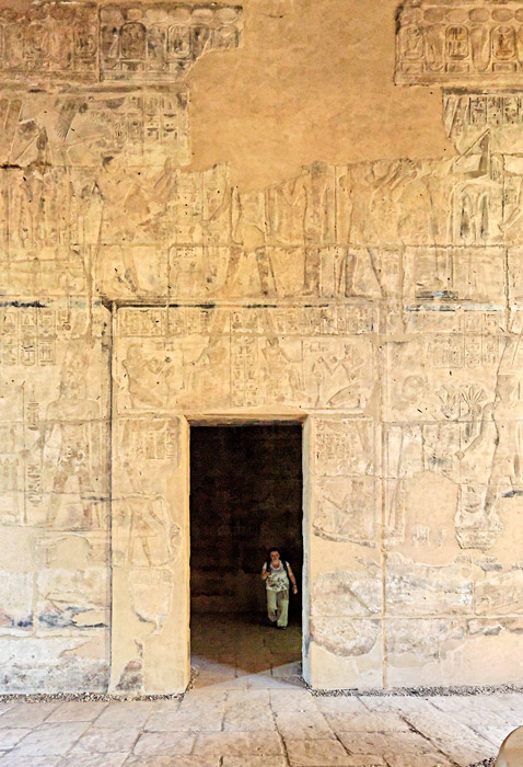 Entrée de la chapelle II : au premier registre, suite de la scène des 4 veaux avec une scène souvent associée, l'offrande des 4 boites colorées ( voir une explication détaillée dans la partie nommée 4 veaux, de la chapelle 34). Ici Sethy les offre à un dieu et une déesse. A droite, Sethy offre une laitue à Min et Isis.