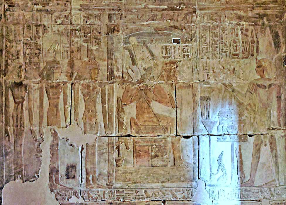 | Paroi dsu fond : dans une scène déjà représentée sur les murs de la salle hypostyle, Sethy encense la Triade Thébaine et lui verse une libation. Ici Khonsou est debout derrière Amon et Mout. |