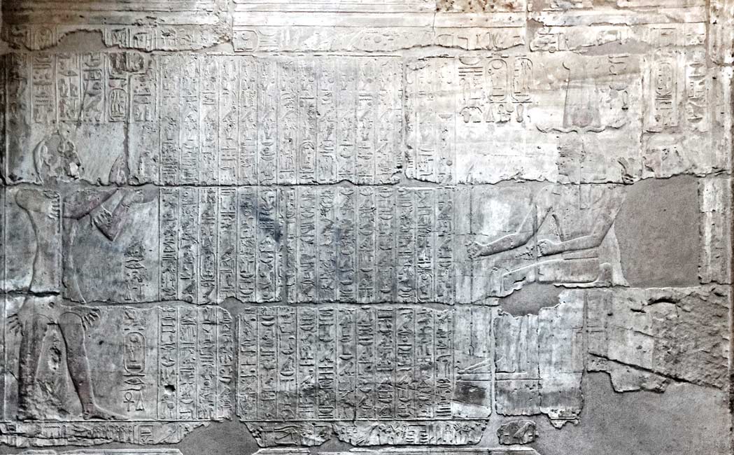 Le roi Sethy offre de l'essence de térébinthe à une statue de Amon-Rê-Kamoutef. En dessous, le texte dit : "...Offrir la résine de térébinthe et faire une libation pour l'ouverture de la bouche de mon père Amon-Min-Kamoutef, celui qui est muni de ses beautés..) (Christophe, 1950). Derrière Amon, , la chapelle généralement associée à Min et une représentation à moitié détruite qui est une figuration du temple de Gournah . Entre les deux,participants, une liste d'offrandes. (Pour le térébinthe, sorte de pistachier, voir Wikipedia). Cette forme d'Amon, qui ressemble à Amenope du temple de Louxor, est une forme spécifique de ce temple. Entre Sethy et Amon, des offrandes et une liste de ces offrandes.