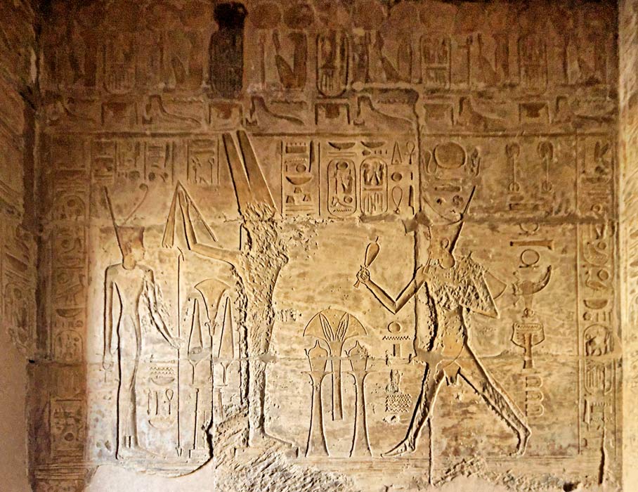 | Cette scène montre le roi courant avec 2 vases dans un rite tirée des fêtes heb-sed. Devant lui, Amon-Rê, représenté ithyphallique comme Min, derrière lequel se tient Amonet. Ainsi, dans cette salle, sont représentées les deux parèdres d'Amon, ici Amonet et en face Mout. Le culte d'Amonet reprit un nouvel essor à la Basse Époque. |