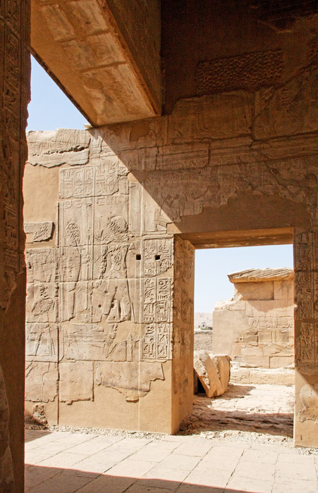 Le montant gauche de la porte est aligné avec le mur de l'hypostyle. A gauche de ce montant, une scène avec Ramsès II offrant de l'encens à Ptah. Sur les montants de la porte, la titulature de Ramsès II. Au dessus, les scènes classiques du roi agenouillé cette-fois ci devant Mout, dont c'est la porte.