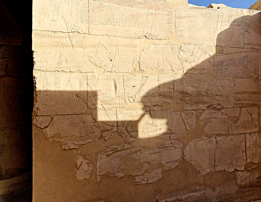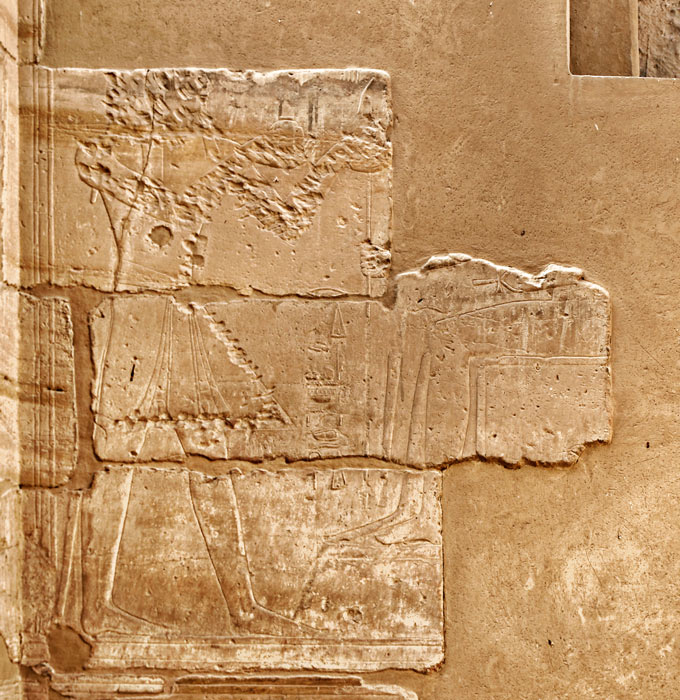 Cette salle est une excroissance de la salle hypostyle qui a été élargie pour permettre l' accès aux salles des barques. Les portes de ces salles donnent, en effet, directement dans la salle hypostyle. Sur la paroi de gauche, Ramsès II court vers Amon. On devine la scène de droite avec le roi faisant une offrande à Amon et Mout. Cette paroi se trouve en face de la porte de la chapelle de la barque de Mout que vous pouvez voir ci-dessous.