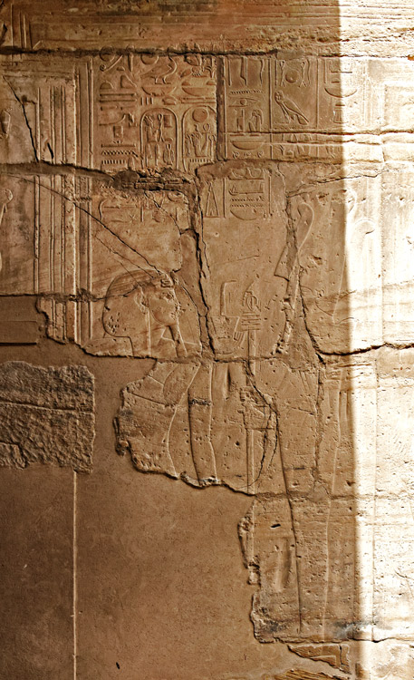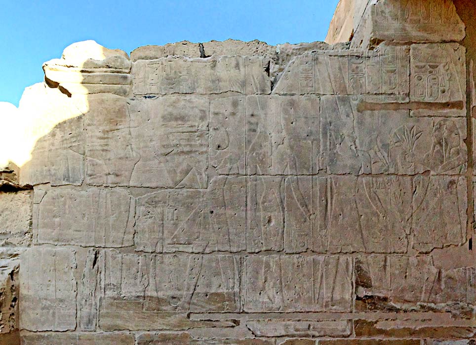 | Deux pans de mur ont été préservés. Sur celui-ci, situé à l'est, à droite, Ramsès II offre des fleurs à Amon et Mout. . A gauche, il offre des vases à Amon et une déesse. |