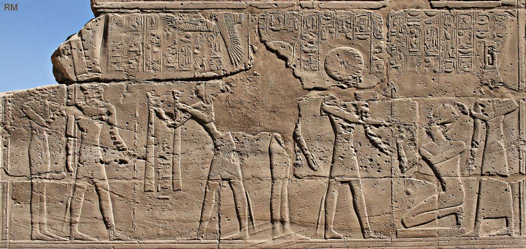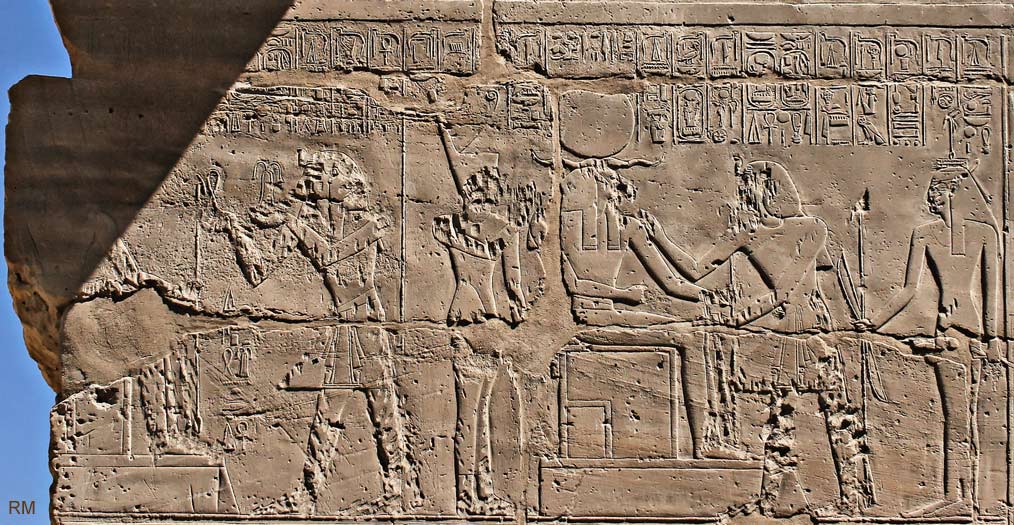 Le roi Sethy offre 2 emblèmes à Amon et Mout(?).