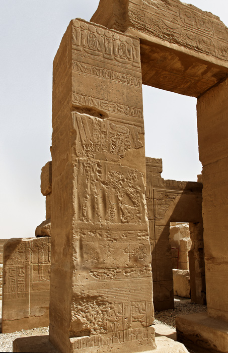 Pilier C, face vers le sud : dans la scène du milieu, Sethy offre un collier large à Amon. En haut du pilier une frise avec le nom de Sethy. Autour du pilier, les titulatures de Sethy. En bas, une frise d'oiseaux rekhyt.