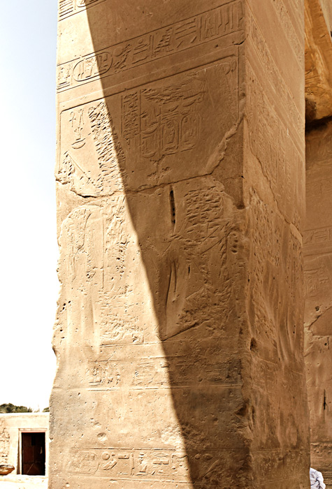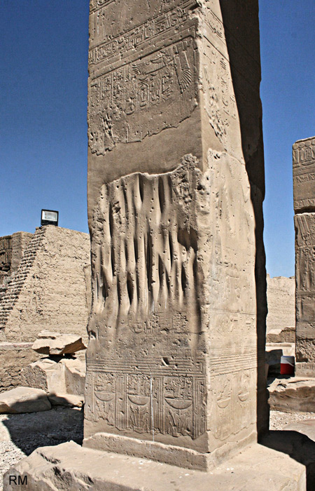 Pilier A, face vers l'est : sur la scène du milieu, Sethy est agenouillé devant Amon avec une offrande dans les mains. Autour du pilier, les titulatures de Sethy..