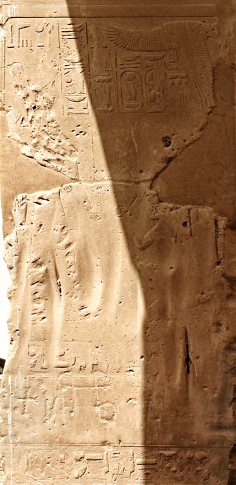 Pilier A, face vers le sud : Sethy devant Isis. Les cupules et les martelages ont largement détérioré la scène.