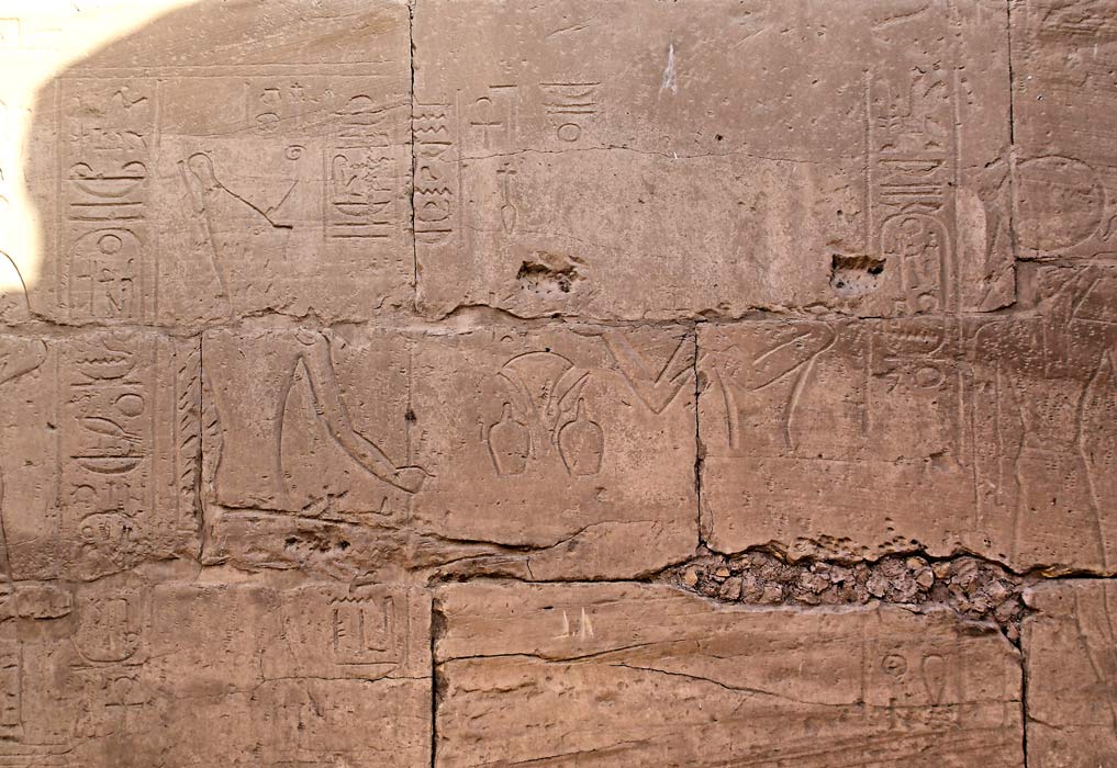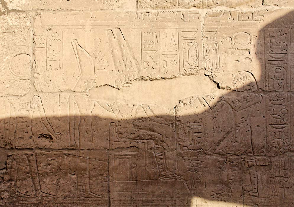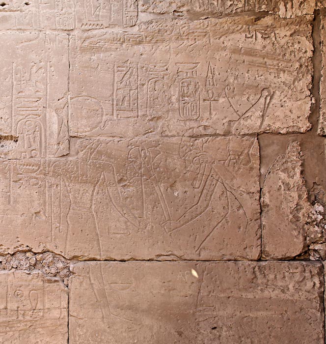 | C'est la scène immédiatement à côté du fond. Ramsès II fait une offrande à la Triade Thébaine. Ici aussi il s'agit de simples traits dans la pierre, sans doute un travail préparatoire à une gravure plus élaborée. |